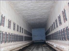 許多單位的熱處理爐采用地坑形式,受限于吊裝、冷卻速度慢等原因,效率比較低。金心公司的熱處理爐是建造在地面上,爐底采用自行走臺車結(jié)構(gòu),臺車載重80t,容器熱處理完畢,啟動開門按鈕,臺車沿導(dǎo)軌進(jìn)入車間,車間內(nèi)的起吊行車迅速將熱處理完成的設(shè)備卸下臺車,再裝另外待熱處理的壓力容器,一個(gè)新的循環(huán)開始,熱處理效率高。