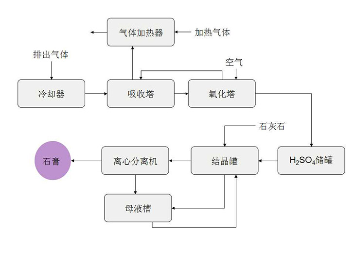燃燒氣體在冷卻器中被冷卻到50-70℃,送入吸收塔,由上部來的稀硫酸將SO2氣體吸收除去入大氣。稀硫酸中的SO2在氧化塔內生成硫酸,返回吸收塔。一定量的稀硫酸在結晶罐內生成石膏,石膏經(jīng)過離心分離機后與母液分開。母液由母液槽返回到吸收塔,石膏結晶進行脫水,直到容易處理的程度為止。